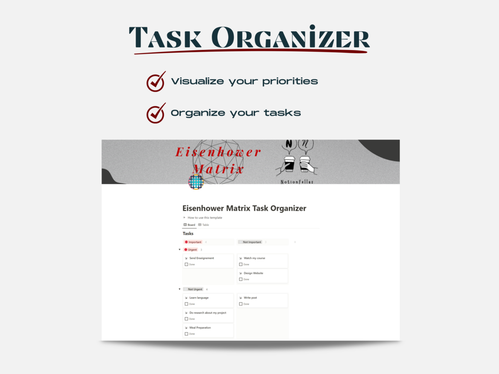 Introducing our game-changing Notion Template: Simplify Task Management with Eisenhower Matrix! Struggling to keep your tasks organized and on track? Feeling overwhelmed by your growing to-do list? Look no further! We have the ultimate solution to supercharge your productivity – our Notion Template, designed specifically to help you conquer your tasks using the powerful Eisenhower Matrix.